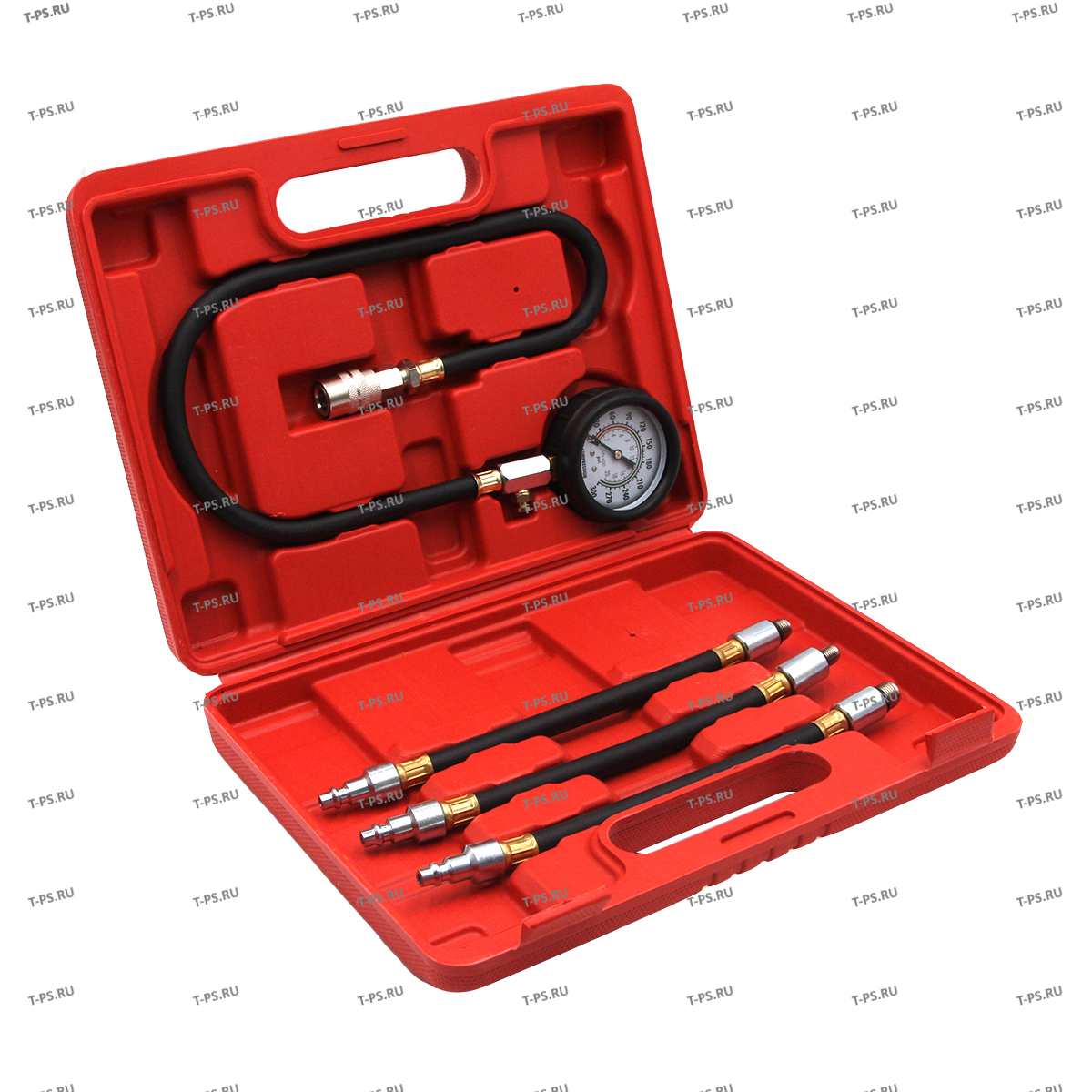 Компрессометр бензиновый с гибкими шлангами предназначен для измерения компрессии в цилиндропоршневой группе ДВС с бензиновым впрыском. Компрессометр оснащен клапаном который дает возможность зафиксировать максимальный показатель давления а так же с помощью этого клапана можно сбросить стрелку показаний на ноль после окончания проверки давления в одном из цилиндров. Входящие в комплект гибкие шланги с адаптерами разных размеров делают возможным проводить проверку компрессии в труднодоступных местах там ге это не возможно сделать с помощью жестких алаптеров. Может применяться для проверки компрессии в двигателях мотоциклов. Комплектация: - Манометр цена деления 0,5 Bar и диапазоном измерения 0..21 Bar (0..300 Psi), длинна шланга без учета быстросъемного соединения 660мм - Резьбовые адаптеры с гибкими шлангами 3шт. Длинна адаптеров 250мм Размер резьбы адаптеров М10, М12, М14. - Противоударный пластиковый кейс