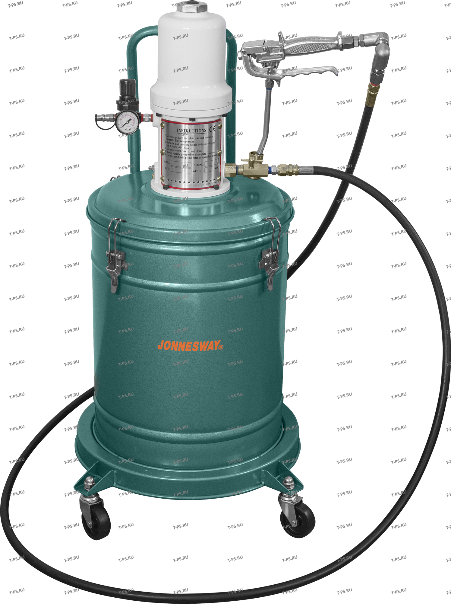 Описание Нагнетатели консистентных смазок применяются при проведении профилактических работ на узлах, агрегатах и механизмах автомобилей, станков и технологической оснсастки, оборудованных пресс- масленкой, для снабжения пар трения пластичными и консистентными смазочными материалами вязкостью NLGI 00/2 (ISO 460/150) в мастерских и цехах, оборудованных воздушной магистралью с давлением воздуха не ниже 6 атм. или компрессором, такой же мощности и необходимой производительности, персоналом, имеющим соответствующую квалификацию, знакомым с правилами техники безопасности, условиями эксплуатации и навыками работы с подобным оборудованием. Область применения Заправка нагнетателя может производиться заполнением емкости свободной формой рабочего материала или использованием с установкой стандартных емкостей (евроведро) до 18 и 25 кг для AE300072 и AE300073 соответственно. Подача смазки нагнетателем осуществляется с помощью центробежного насоса, имеющего привод от пневматического роторно-лопастного двигателя. Регулировка скорости подачи смазки осуществляется изменением частоты вращения привода насоса с помощью регулятора, установленного на корпусе насоса. Технические характеристики