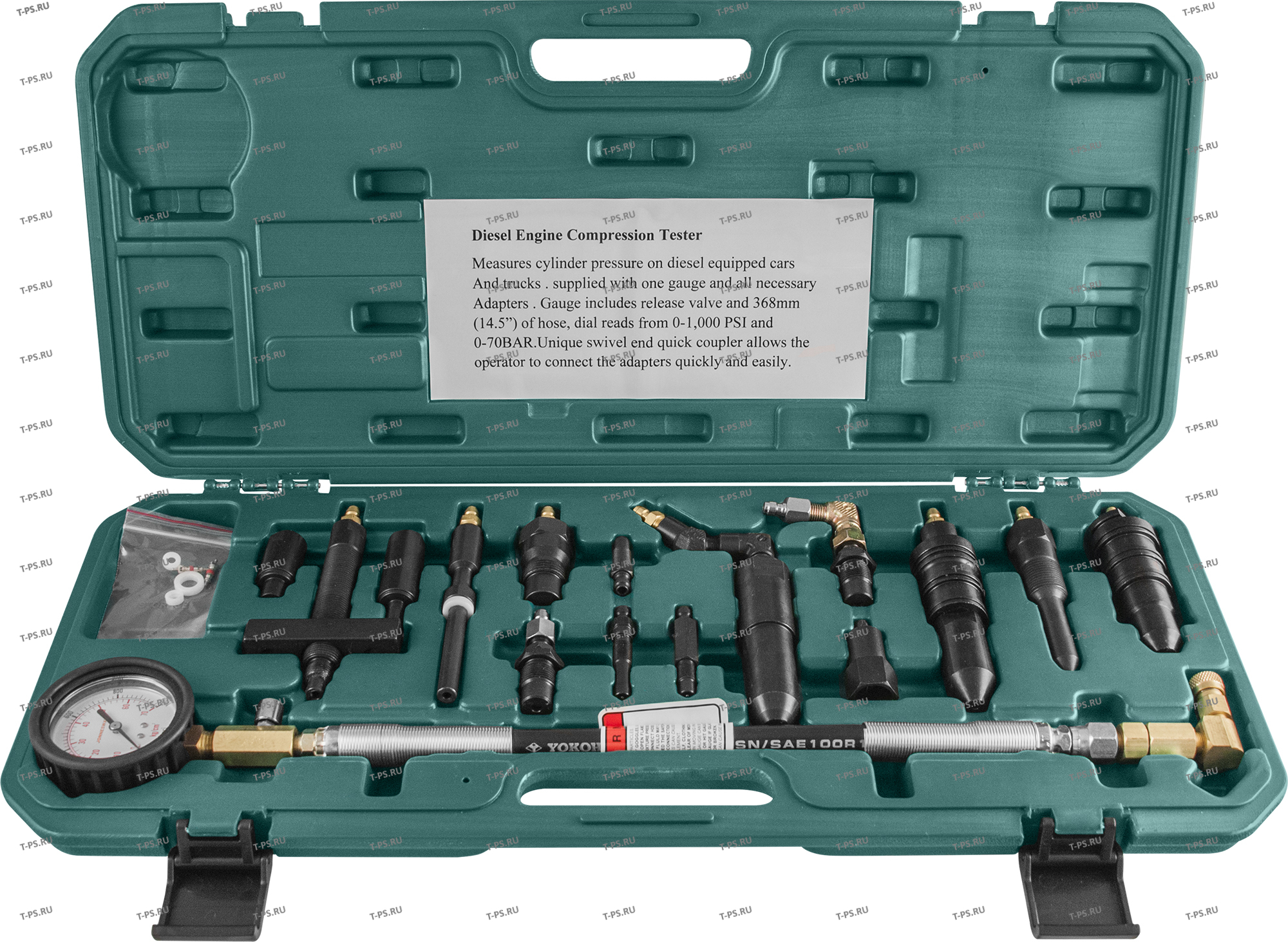 Описание Универсальный компрессометр дизельных двигателей Jonnesway. Изделие снабжено гидронаполненным аналоговым манометром, градуированным от 0 до 70 кгс/смкв. (0-1000 PSI). Соединительный шланг рассчитан на пиковое давление 300 кгс/смкв.. В комплект поставки входят 13 адаптеров, применяемых при производстве работ по диагностике дизельных двигателей производства: FORD, GM, VAG, CUMMINS, MB, VOLVO, BEDFORD, JOHN DEERE, FIAT, INTERNATIONAL, MACK, BMW, PEOGEOT, ISUZU, TOYOTA, DETROIT DIESEL, CATERPILLAR. Область применения Универсальный компрессометр применяется для диагностики работоспособности и обнаружения неисправностей цилиндропоршневой группы и газораспределительного механизма дизельных двигателей внутреннего сгорания. Порядок работы 1. Запустить двигатель и прогреть до рабочей температуры. 2. Отсоединить питание свечи накаливания или топливопровод форсунки. Снять свечу накаливания или форсунку из цилиндра и присоединить соответствующий адаптер.* З. Перед началом теста отключите подачу топлива, отсоединив соленоид топливного насоса 4. Соедините компрессометр с гнездом свечи накаливания или гнездом установки топливной форсунки. 5. Перед тестом проверьте состояние аккумуляторной батареи. Для определения компрессии цилиндра должно хватить 8-10 оборотов коленчатого вала. Проведите тест, как того требует инструкция производителя двигателя. Проверьте полученные результаты по таблице производителя двигателя. 6. Чтобы повторить тест на том же самом цилиндре, воспользуйтесь кнопкой клапана сброса. 7. Чтобы провести тест на другом цилиндре присоедините компрессометр к соответствующему цилиндру. Сравнение показаний по всем цилиндрам - лучший способ оценить состояние клапанов или поршневых колец.