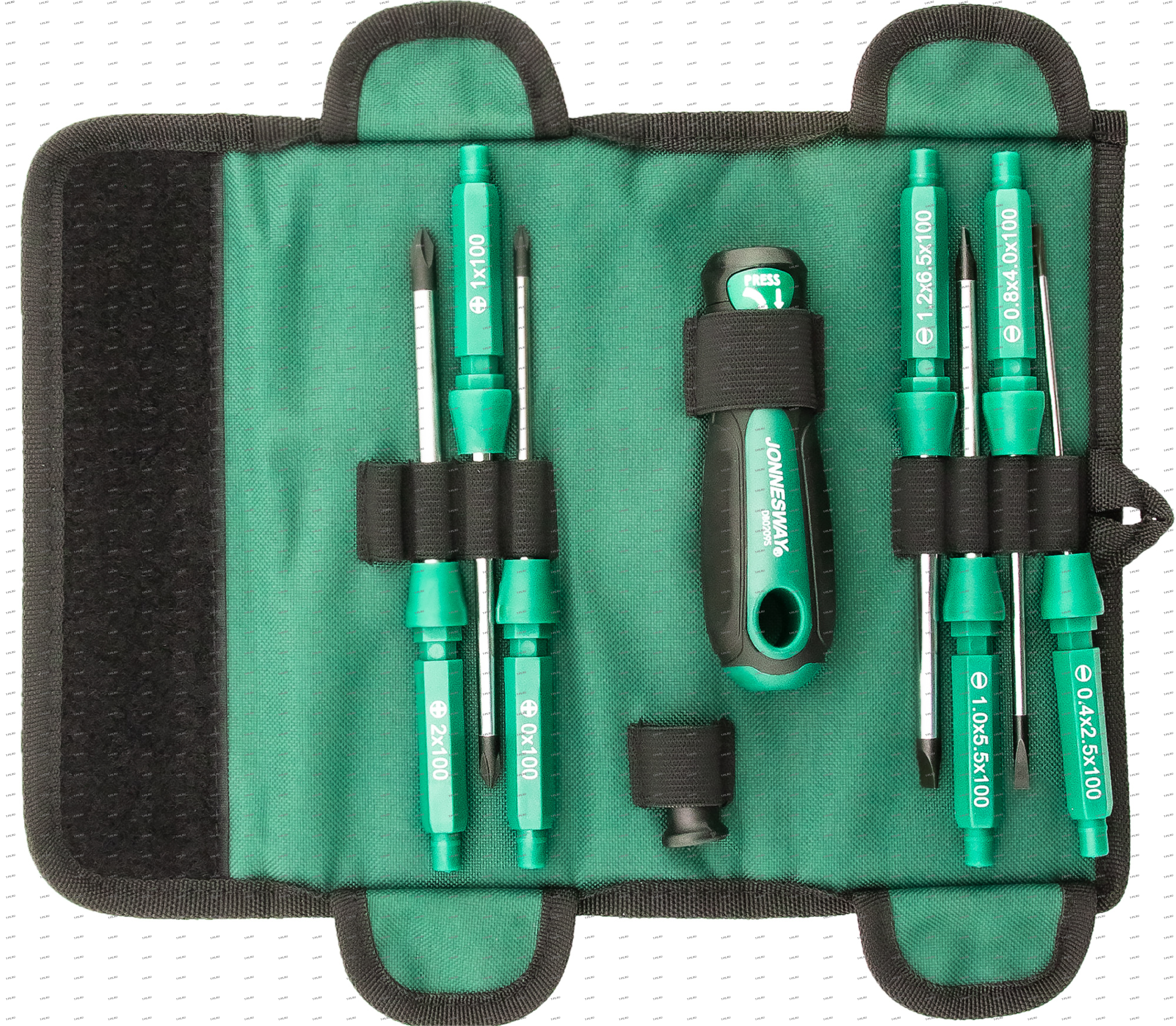 Стержни отверточные 7 шт.: SL2.5x100 мм, SL4х100 мм, SL5.5х100 мм, SL6.5х100 мм, PH0х100 мм, PH1х100 мм, PH2х100 мм Рукоятка отверточная Втулка пластиковая Сумка-чехол |