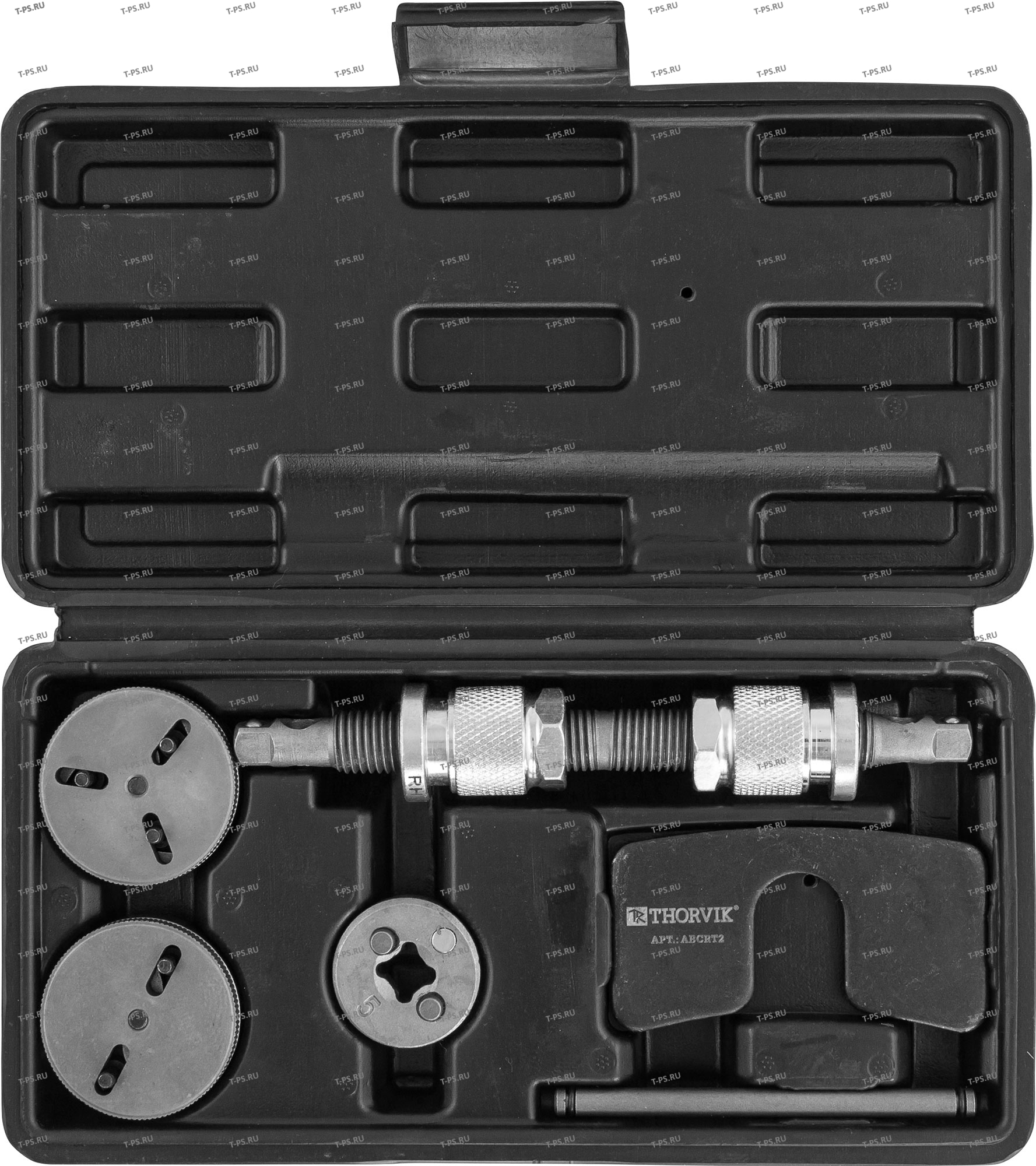 Описание Набор для возврата поршней дисковых тормозных механизмов применяется при ремонте и обслуживании суппортов дисковых тормозов легковых автомобилей. Принцип действия данного инструмента основан на воздействии путем совмещения двух усилий, вращательного, перпендикулярно оси вращения поршня, и осевого, для возврата в исходное положение поршня рабочего цилиндра тормозного суппорта. Ходовой винт с правосторонней и левосторонней резьбой, а также наличие двух насадок с двумя и тремя регулируемыми по ширине направляющими, позволяет обслуживать тормозные системы широкого дипазона автотранспортных средств. Область применения Приспособление применяется для производства работ по замене тормозных колодок дисковых тормозов.
