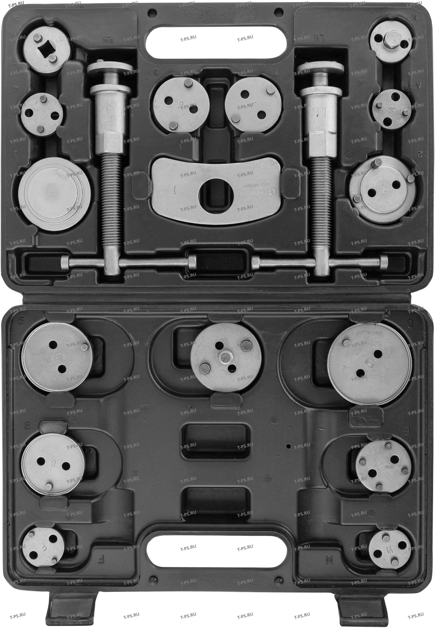 Описание Набор для возврата поршней дисковых тормозных механизмов применяется при ремонте и обслуживании суппортов дисковых тормозов легковых автомобилей. Принцип действия данного инструмента основан на воздействии путем совмещения двух усилий, вращательного, перпендикулярно оси вращения поршня и осевого, для возврата в исходное положение поршня рабочего цилиндра тормозного суппорта. Наличие большого количества насадок обусловлено разнообразием форм днищ поршней тормозных цилиндров у разных производителей. Область применения Приспособление применяется для производства работ по замене тормозных колодок дисковых тормозов.