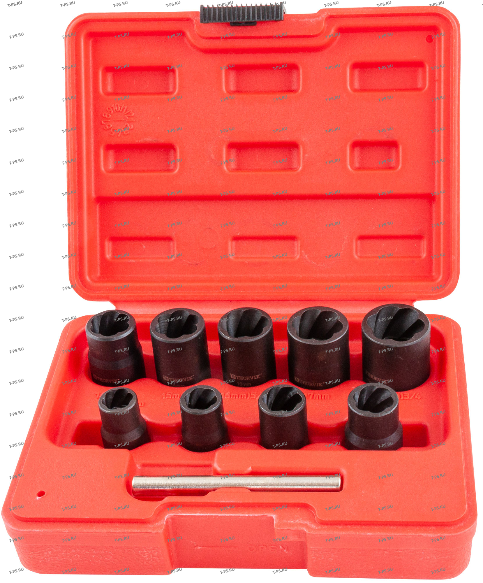СОДЕРЖАНИЕ: Головки торцевые спиральные для поврежденного крепежа, 9 шт: 10, 11, 12, 13, 14, 15, 16, 17, 19 мм, Выколотка Ø8 мм, Пластиковый кейс. |