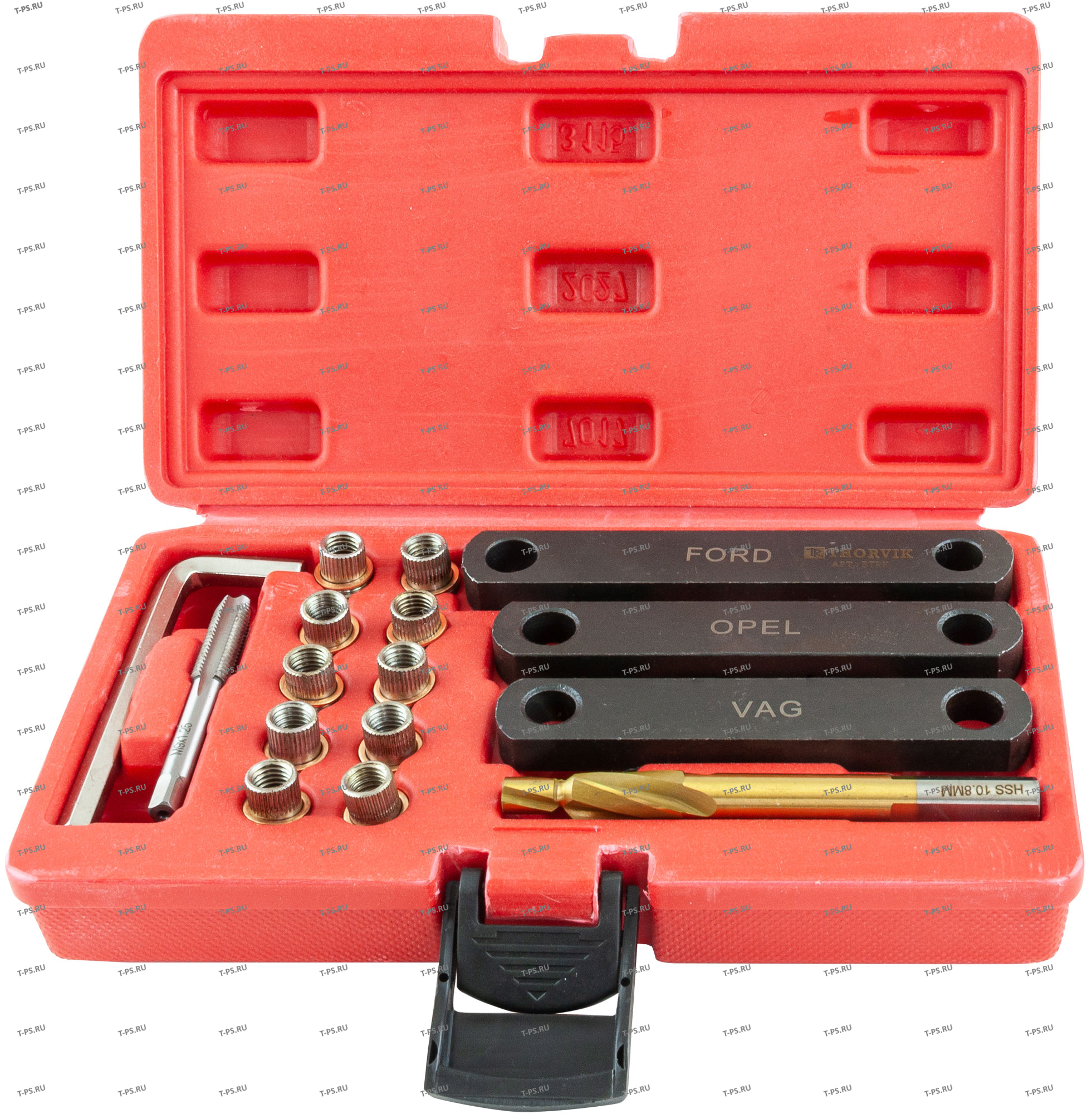 Ключ торцевой шестигранный, 7 мм Метчик М9х1.25 Вставки резьбовые М9х1.25 Шаблон для VAG (91 мм*) Шаблон OpelGM (94 мм*) Шаблон Ford (105 мм*) Сверло ступенчатое, 8х10 мм Пластиковый кейс Краткая инструкция на русском языкегарантийный талон * ме |