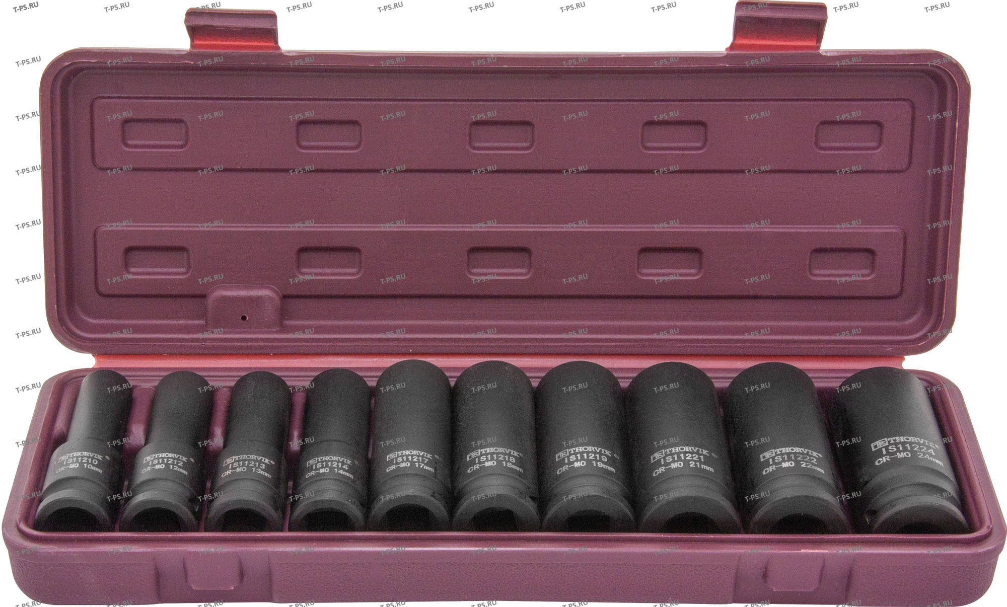 Описание Набор головок торцевых ударных глубоких 1/2DR, 10-24 мм, 10 предметов. Торцевые головки Thorvik изготовлены с применением технологий, позволяющих передавать усилия, превышающие расчетные по современным стандартам на 30%. Широкий диапазон размеров, типов и профилей, высокая точность обработки, качественная хромомолибденовая сталь (Cr-Mo) и устойчивое фосфатированное покрытие делают инструмент надежным и долговечным. Торцевые головки Thorvik являются основной для создания систем сборного слесарно-монтажного инструмента. Имеет отверстие для фиксирующего штифта и выточка для уплотнительного кольца. Область применения Служит для начального откручивания крепежных деталей с 6-гранным рабочим профилем. Позволяет прилагать максимально допустимые для торцевых головок рабочие нагрузки. К минусам можно отнести сложность с позиционированием на крепеже, что при наличии трещоточной рукоятки не имеет значения. Размеры