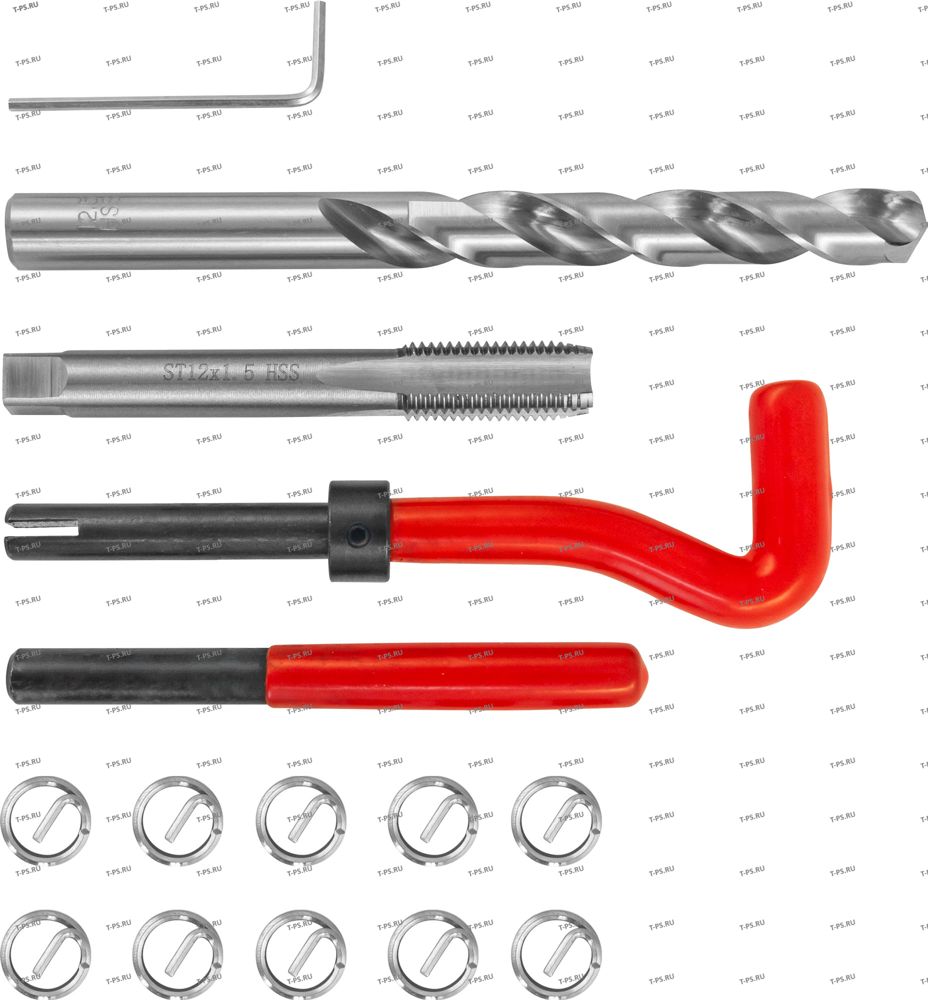 Сверло спиральное по металлу по DIN 338 Метчик STI по DIN 8140-2 Вороток установочный (с предохранительным кольцом для ограничения глубины) Демонтажная оправка (для удаления поводка) Ключ торцевой шестигранный Резьбовые вставки (15 шт.) |