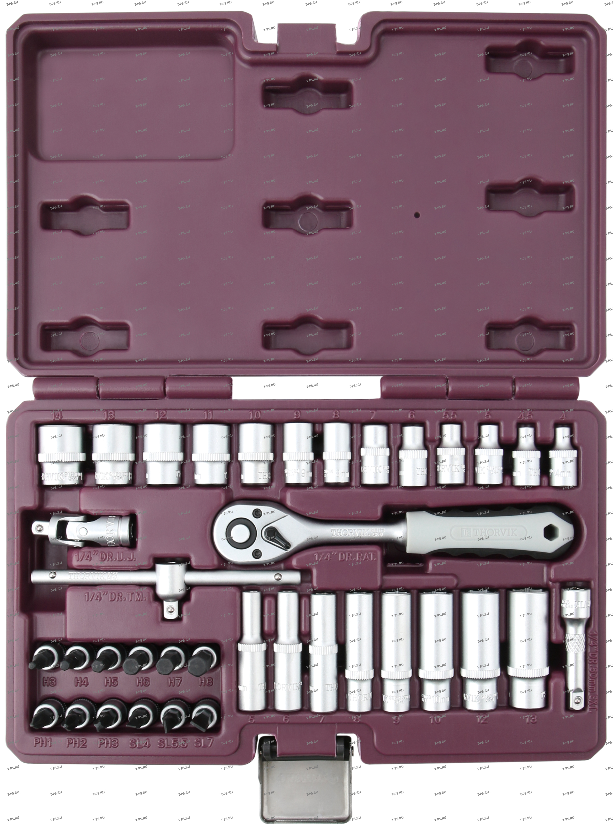 Головки торцевые 14DR, 13 шт.: 4, 4.5, 5, 5.5, 6, 7, 8, 9, 10, 11, 12, 13, 14 мм Головки торцевые глубокие 14DR, 8 шт.: 5, 6, 7, 8, 9, 10, 12, 13 мм Насадки с вставками 14DR, 12 шт.: (РН)1, 2, 3, (H)3, 4, 5, 6, 7, 8 мм, (SL) 4, 5.5, 7 мм Удлинитель 14D |