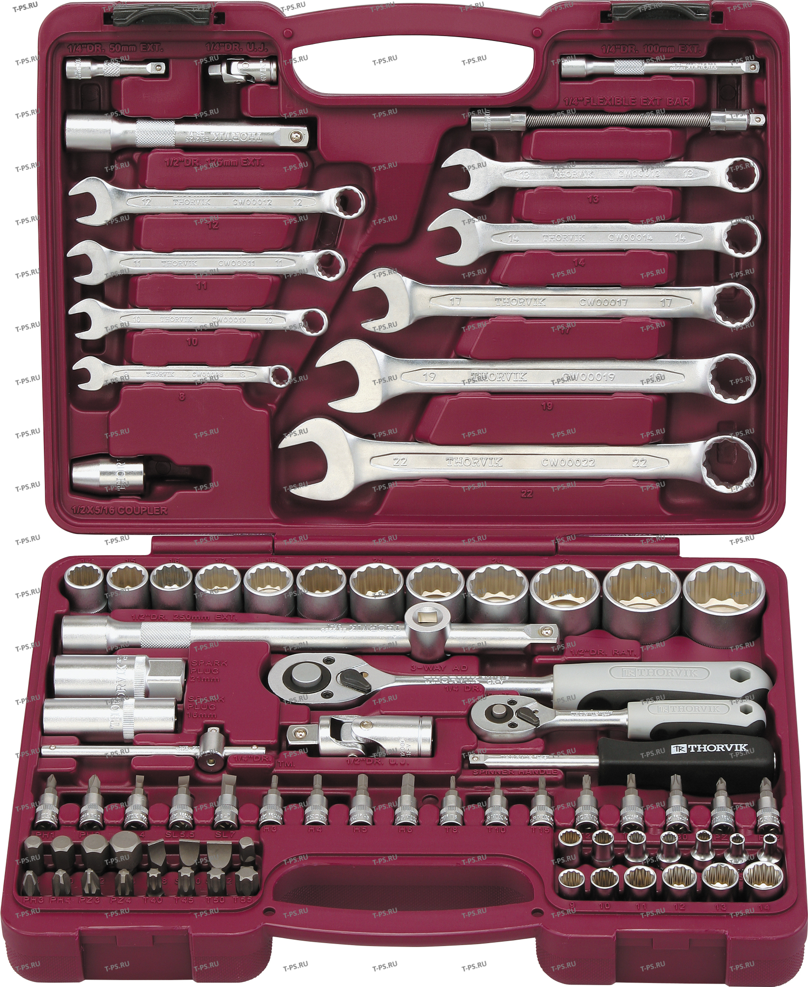 Описание Инструментальные наборы Thorvik - это высокое качество изделий, входящих в состав наборов, удобные прочные кейсы для хранения, оптимальная комплектация позволяющая удовлетворить потребность мастера при обслуживании техники и обеспечить всем необходимым рабочее место при производстве комплексных слесарно-монтажных или механосборочных работ. Наборы Thorvik имеют ударопрочный морозоустойчивый кейс с надеждными защелками. Самые полные и удобные по наполнению комплектации для всех типов задач. Область применения Универсальный набор инструмента с адаптированным ассортиментом изделий, позволяющих производить определенный спектр операций по обслуживанию различных резьбовых соединений, включая обслуживание непрофилированных деталей и деталей с разнообразными внутренними рабочими профилями.